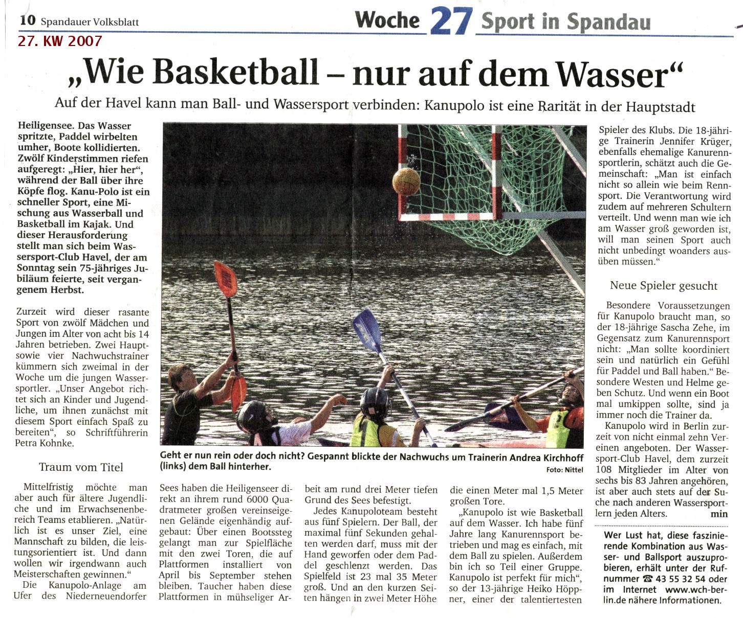 Jugendvertreter Als Jugendvertreter des WCH sind gewählt worden: Jakob Riemer und Daniel Patzke Zur Erinnerung - Es begann in unserem Verein 2006: Obwohl bei regem Interesse pünktlich am 01.07.06 der Startschuss für unser neues Angebot im Schüler- und Jugendbereich fiel, eröffnete eigentlich die Bezirksbürgermeisterin von Reinickendorf Frau Marlies Wanjura und Herr Bezirksstadtrat Frank Balzer einen Tag später die Kanu-Polo-Saison durch einen Besuch: