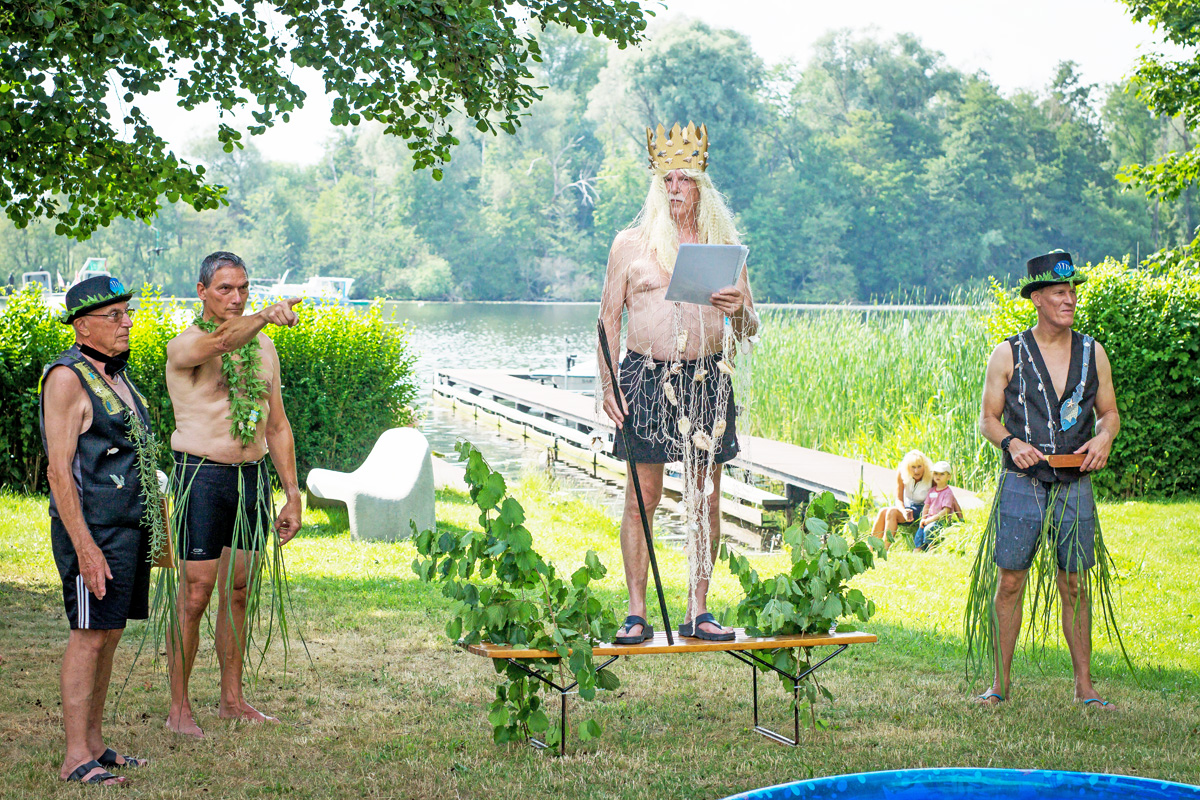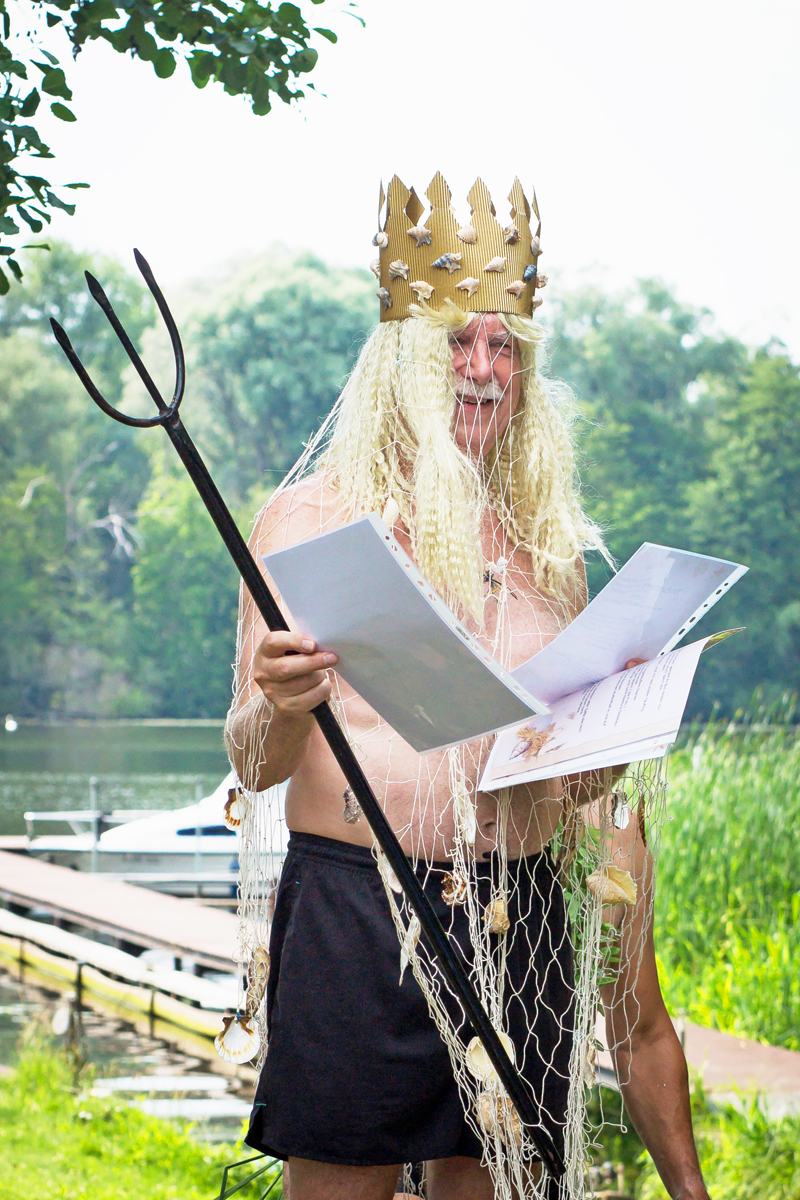 Anschließend landete Neptun mit seinen Helfern an und übergab dem Verein als erstes eine neue Vereinsfahne, bevor die Täuflinge aufgerufen wurden. Und wie auf Bestellung - zum Abschluss der Zeremonie grollte der Himmel und mit einem echten Donnerschlag kam der Regen.