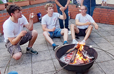 Endlich wurden die Feuerschalen auf der Terrasse entfacht. Musik, Tänzchen und Marshmallows über Feuer rundet alles ab. Und alles bei trockenem Himmel und einigen Sonnenstrahlen.